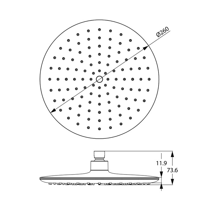 Душевая насадка верхняя, круглая, материал ABS пластик, диаметр 260 мм, белая лицевая пластина, темно-серые форсунки, верхняя пластина ABS-пластик.Легкая очистка благодаря форсункам из мягкого TPR, шарнирное соединение позволяет настроить угол наклона лейки.https://youtu.be/ujIm-yWJqLc