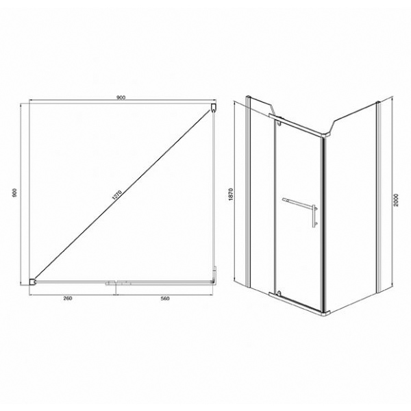 Габаритные размеры ШхВхГ: 900*2000*900 ммСтенки и дверца душевого уголка - прозрачное стекло толщиной 6 ммПрофиль из матового алюминияРучка - нержавеющая стальВертикальное расположение петель препятствует провисанию и перекосу двери.Квадратный низкий поддон из ABS пластика