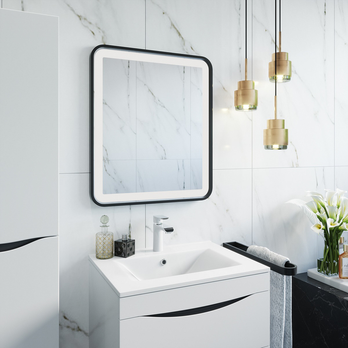 Зеркало для ванной с LED-подсветкой, 4мм. Размеры: 35х600х700 мм (ДхШхВ). Корпус сталь, цвет черный матовый.LED лента по периметру подложки. Термообогрев включается вместе с подсветкой. Сенсорный включатель, с логотипом Iddis