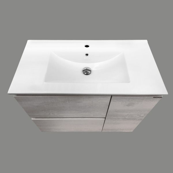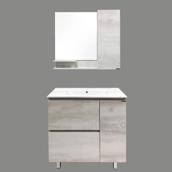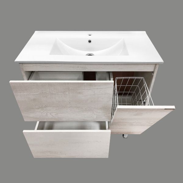 Напольная тумба-умывальник с двумя выдвижными ящиками и одной створкой. Ящики оснащены петлями с системой плавного закрывания. Створка откидная с корзиной для белья.