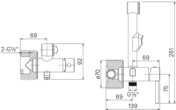 Оснащение: держатель для душа / душевой шланг / крючок