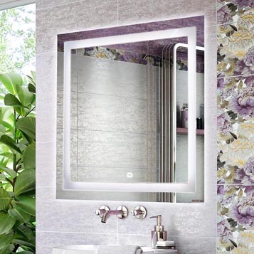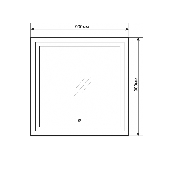 Зеркало оснащено встроенным светодиодным светильником размещенным по периметру и сенсорной кнопкой включения подсветки. Высококачественное зеркальное полотно с амальгамой на основе серебра. Габариты (ШхВхГ): 900*900*40 мм