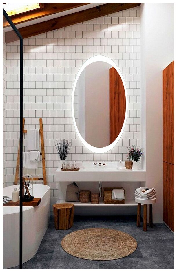 LED подсветка сенсорный выключатель блок питания крепление зеркала (кронштейн с крюком) вилка сетевой шнур Потребляемая мощность 32 W. Класс защиты IP44.